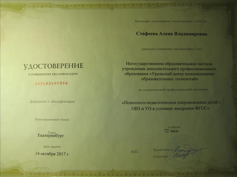 Удостоверение о повышении квалификации, г. Екатеринбург 2017год