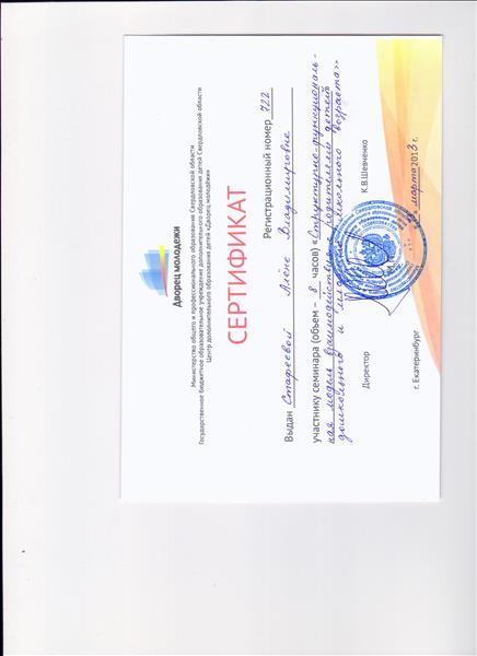 Свидетельство о повышении квалификации г. Екатеринбург, 2013 год